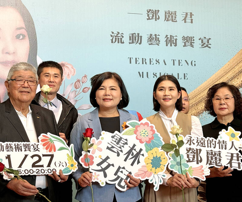 Late Taiwanese signer Teresa Teng’s eldest brother, Teng Chang-an, front row, first left, Yunlin County Commissioner Chang Li-shan, front row , second left, and Yunlin County Cultural Affairs and Tourism Department Director Chen Pi-chun, front row, second right, hold placards and flowers at a news conference in the county yesterday to promote a music event from Jan. 27 to 29 to commemorate Teresa Teng, who was born and raised in Yunlin.