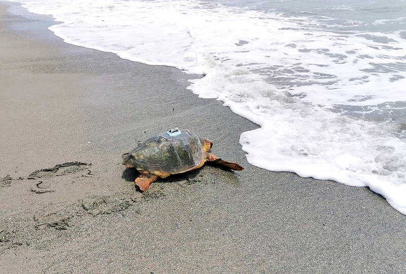 The National Museum of Marine Biology Aquarium in Pingtung County yesterday released a green sea turtle back into the wild with a tracker, saying that its migratory path could help explain why sea turtles on the east coast are more prone to tumors.