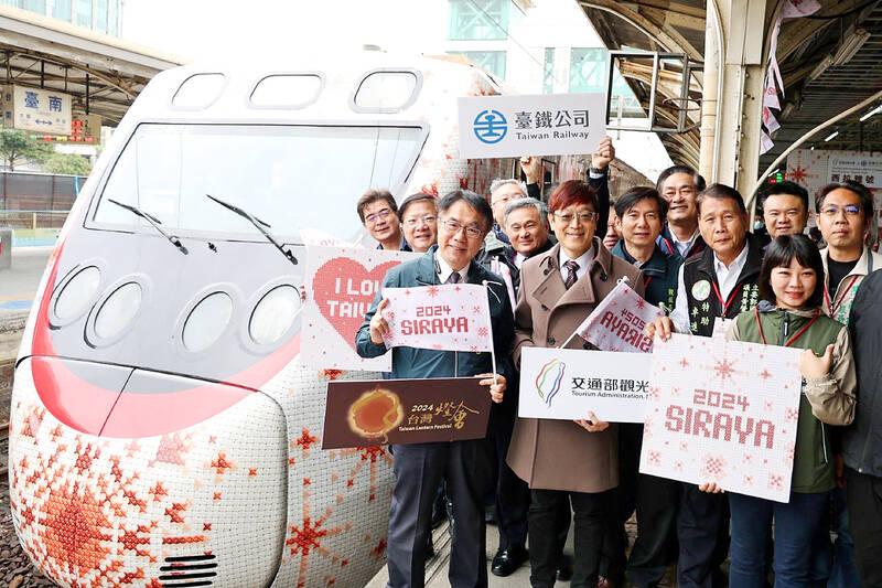 Tainan Mayor Huang Wei-che, front left, and other officials celebrate the inaugural journey of a Taiwan Railway Co train decorated with a design inspired by Siraya culture at Tainan Railway Station yesterday. The Tourism Administration yesterday defended the decoration against critics who said the radial design and red color made it look like blood.