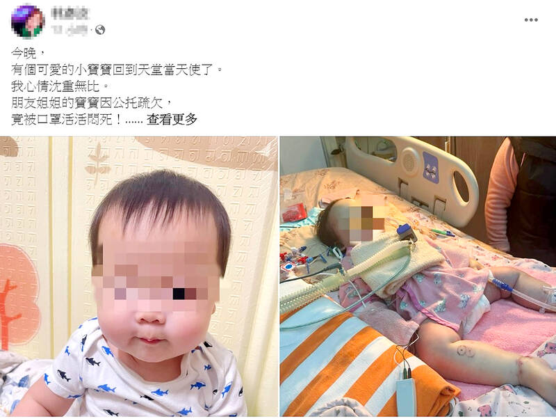 Posting two photographs of an infant, including one with him on a hospital bed and intubated, news anchor Lin Yen-ju (林彥汝) on Tuesday night wrote on Facebook page that a nearly one-year-old child of her friend’s sister had suffocated due to negligence at a public infant center, and that the child’s parents wished to publicize the case as a warning.