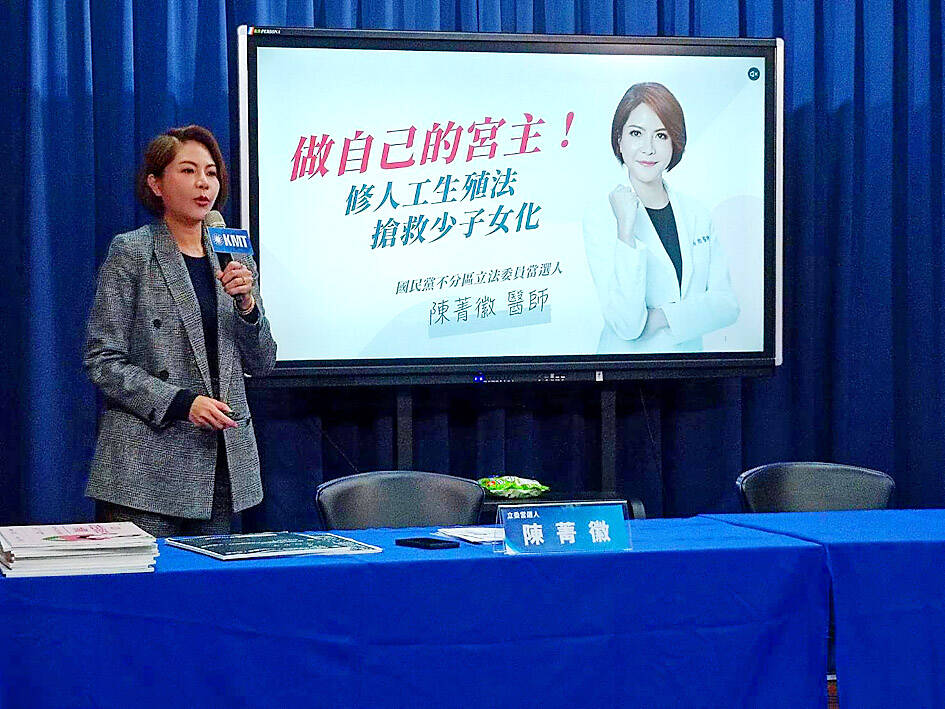 “The act has limited access to assisted reproductive procedures to married heterosexual couples, but it should apply to unmarried couples, single women and lesbian couples as well. The procedures are technically feasible and have a higher success rate, and they would help raise the nation’s declining birthrate in the short term,” said KMT legislator-elect Chen Ching-hui (陳菁徽), who is also a fertility specialist.