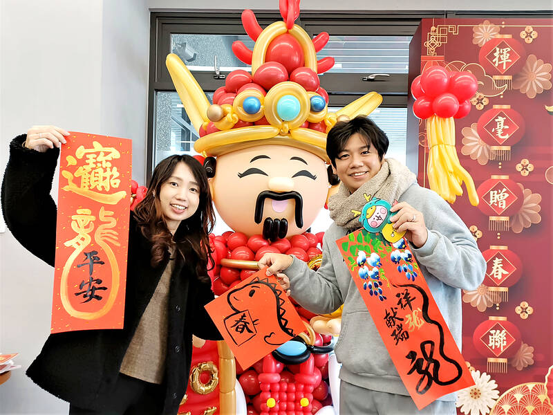 People hold Lunar New Year spring couplets written by calligraphy masters at an event hosted by the Bali District Office in New Taipei City yesterday where free spring couplets were handed out to the public for the upcoming Lunar New Year of the Dragon.