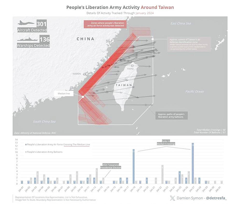Last month, 301 aircraft and 136 ship sorties were detected in the area surrounding Taiwan, including 58 aircraft sorties that flew over the median line of the strait, MND reports showed.