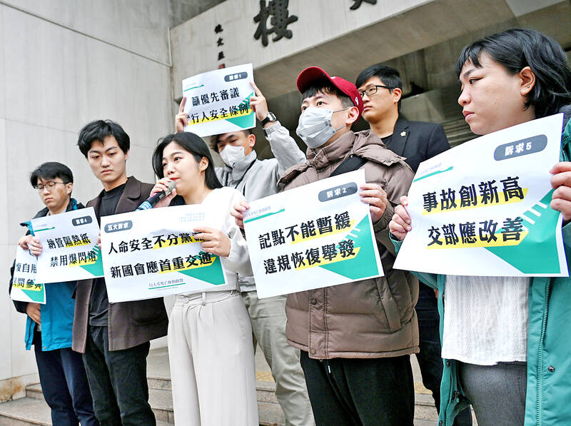 “We also urge the National Land Management Agency to quickly submit its proposed version of the draft pedestrian safety facility act, so that it can be delivered to the upcoming legislative session for deliberation after the Executive Yuan reviews and approves it,” it said.