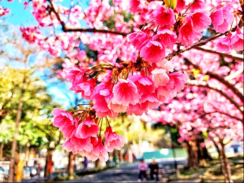 Cherry blossoms hang off a branch at the Taipei Water Park yesterday. The park said it would be closed on Friday, and people who purchase a ticket to enter between Saturday and Wednesday next week would receive a small gift. The park is to be closed for a construction project from Thursday next week to April 15.