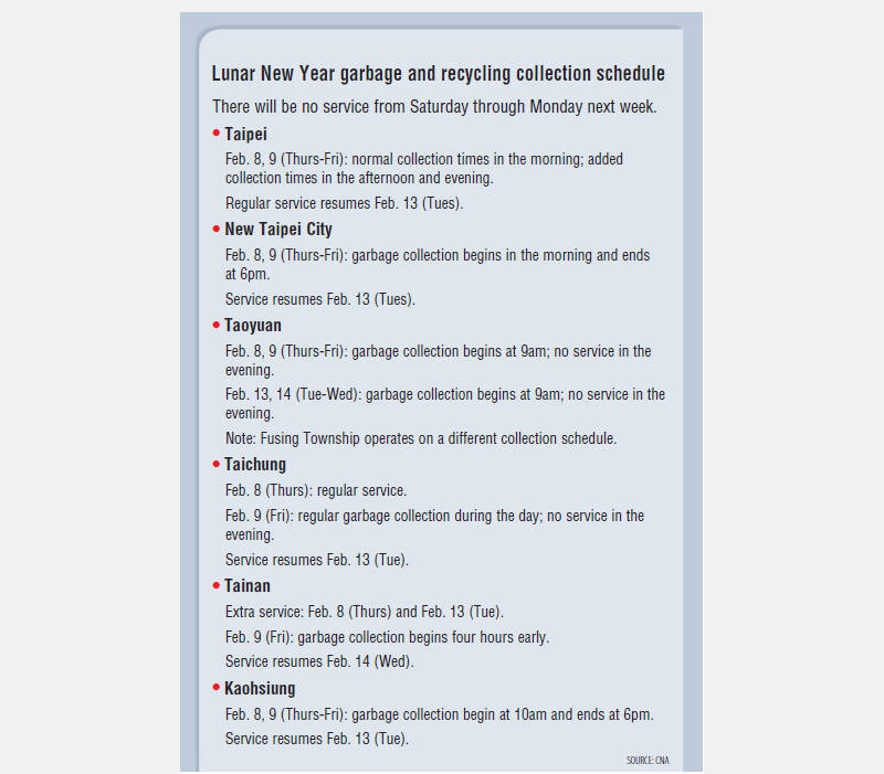 Feb. 9 (Fri): regular garbage collection during the day; no service in the evening.