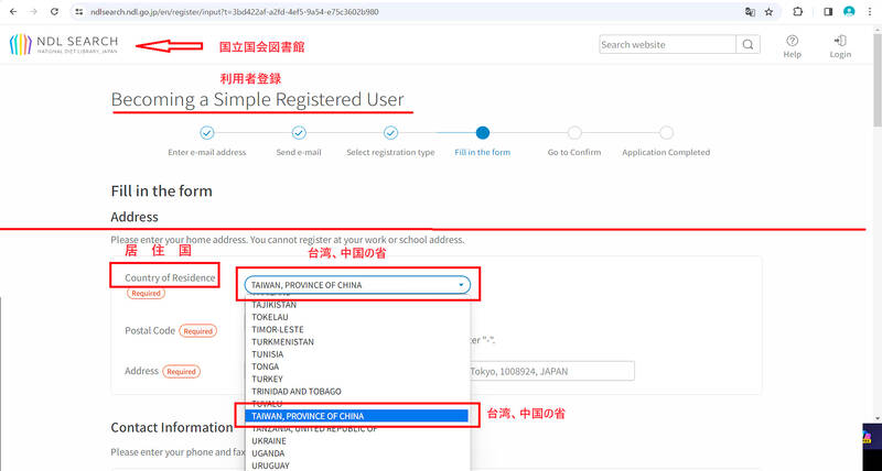 Members of the public must register as a member to use the NDL Search and they are required to select a country of residence. While people can choose “Taiwan” in the Japanese version of the Web site, they can only choose “Taiwan, Province of China” in the English version.
