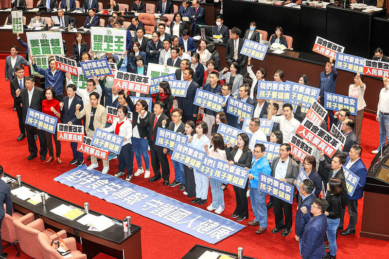 Legislative Speaker Han Kuo-yu (韓國瑜) called for the premier to deliver the address at 10:27am, but KMT legislators swarmed the podium to block Chen from taking his place, chanting the slogan: “We want food safety for our children; legislative reforms for the truth.”