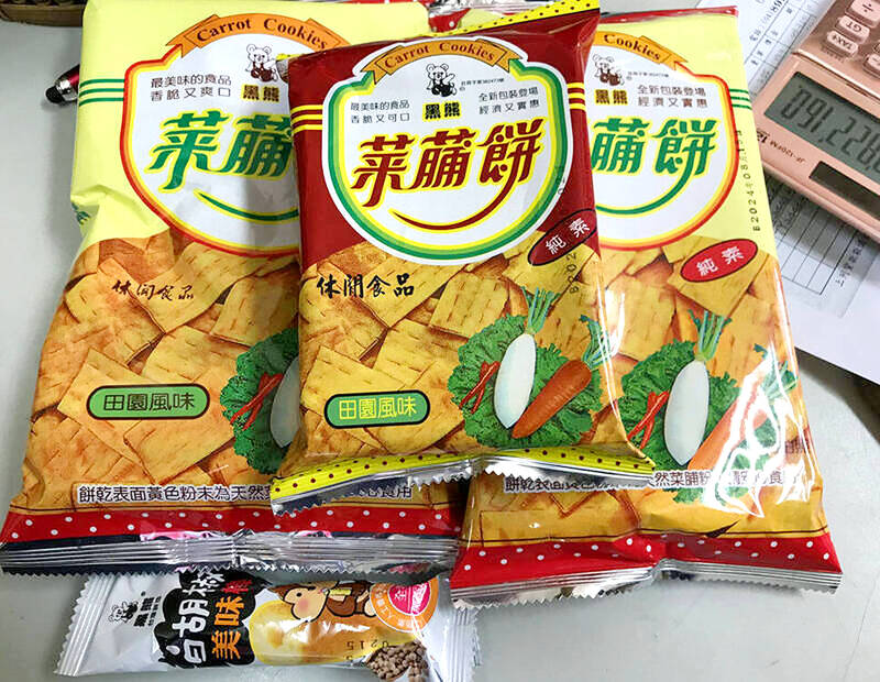 The Miaoli bureau said 2,338 boxes of carrot cookies and 39 barrels of unpackaged white pepper sticks weighing 900g each were found at the company, the bureau said, adding that they were sealed on site and Hsin Hao Food was banned from shipping them.