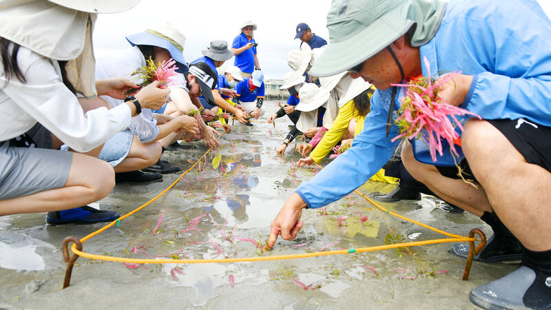 Members of the Penghu Fishery Research Center and students from Magong City Fenggui Primary School in Penghu County work to conserve seagrass in a photograph shown yesterday at an event held by the Fisheries Research Institute marking World Seagrass Day.