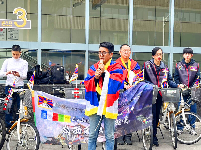 Human Rights Network for Tibet and Taiwan secretary-general Tashi Tsering, front center, leads a crowd in a chant in support of Tibet during a Cycling for a Free Tibet event in Kaoshiung yesterday. The event is being held ahead of Tibetan Uprising Day on March 10 to raise public awareness of Tibetans’ struggle for freedom.
