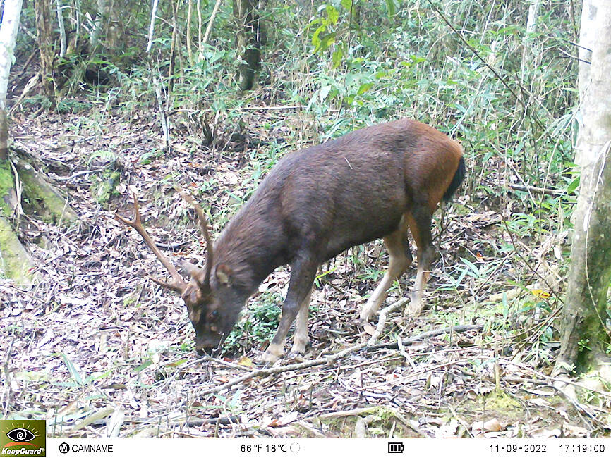 Efforts to restore wildlife populations are bearing fruit, with photographs taken from trail cameras confirming the presence of Formosan sambar deer at lower altitudes at Taroko National Park in eastern Taiwan.