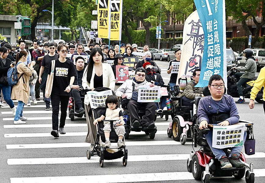 People with disabilities and pedestrian-rights activists yesterday protested in Taipei and other cities against the Cabinet’s planned decision to reduce the punishment for minor traffic violations.