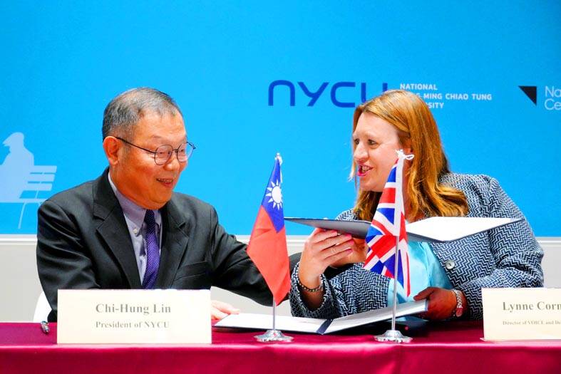NYCU president Lin Chi-hung (林奇宏) and NICA deputy director Lynne Corner signed the memorandum at a news conference in Taipei, making the university the center’s first partner in Taiwan.