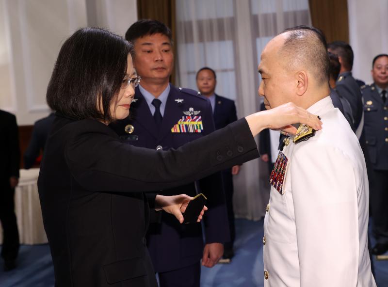 Tang on Tuesday accompanied President Tsai Ing-wen (蔡英文) to a navy base in Yilan County for a handover ceremony for two new Tuo Chiang-class corvette warships, which the navy calls "carrier killers" for their high maneuverability, stealthiness and anti-ship missiles.