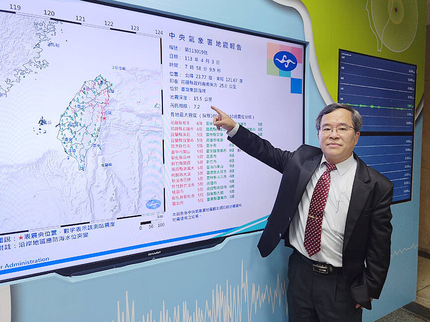Former CWA seismological center director Kuo Kai-wen (郭鎧紋) said that yesterday’s earthquake was different from the 921 Earthquake in that the seismic energy released through the latter was equivalent to the explosion of 46 atomic bombs.