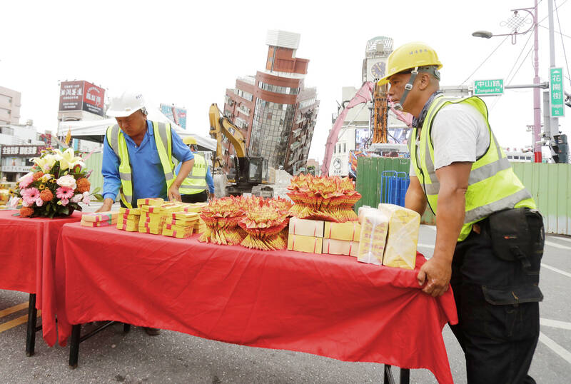 Fruit, flowers and incense paper were laid on a table yesterday, as authorities prepared a ceremony before demolishing a precariously tilting building that has become a symbol of Taiwan’s biggest quake in 25 years.