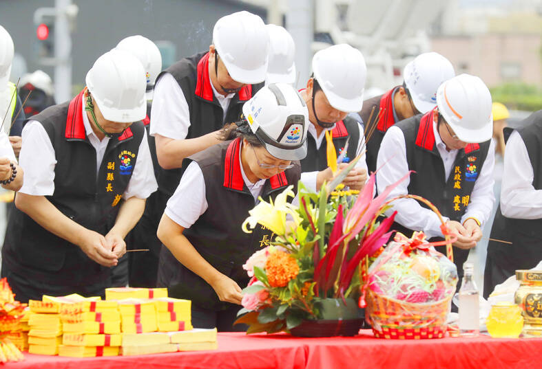 Hualien County Commissioner Hsu Chen-wei (徐榛蔚) and other officials wearing construction vests each lit a joss stick and bowed to the building.