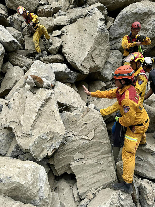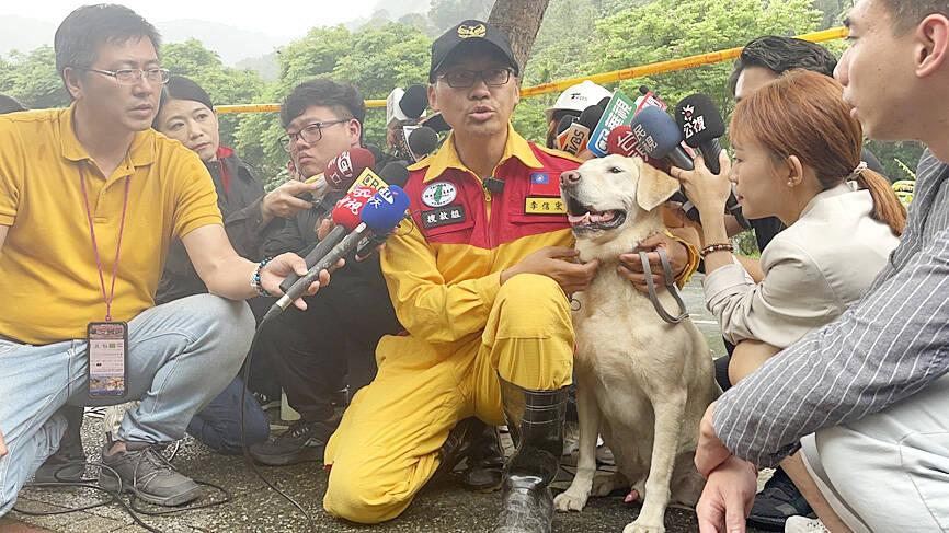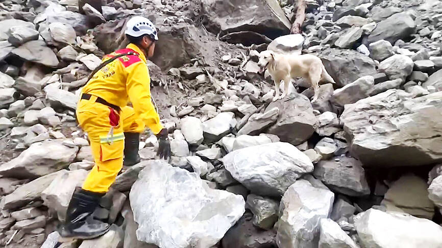 Landslides around the epicenter in Hualien still blocked tunnels and roads, making the mountainous terrain around the county difficult for rescuers to access survivors and victims. Footage released by the county fire department on Saturday last week showed Roger, an eight-year-old Labrador, mounting a boulder that had fallen across a hiking trail near Hualien’s Taroko National Park. “Have you found something? Let’s go over there,” said a rescuer to Roger, who did not budge. Kaohsiung Mayor Chen Chi-mai (陳其邁), whose city sent a rescue team and dogs including Roger, said the Labrador specializes in “rubble pile search and rescue” and that he is trained to search for survivors.