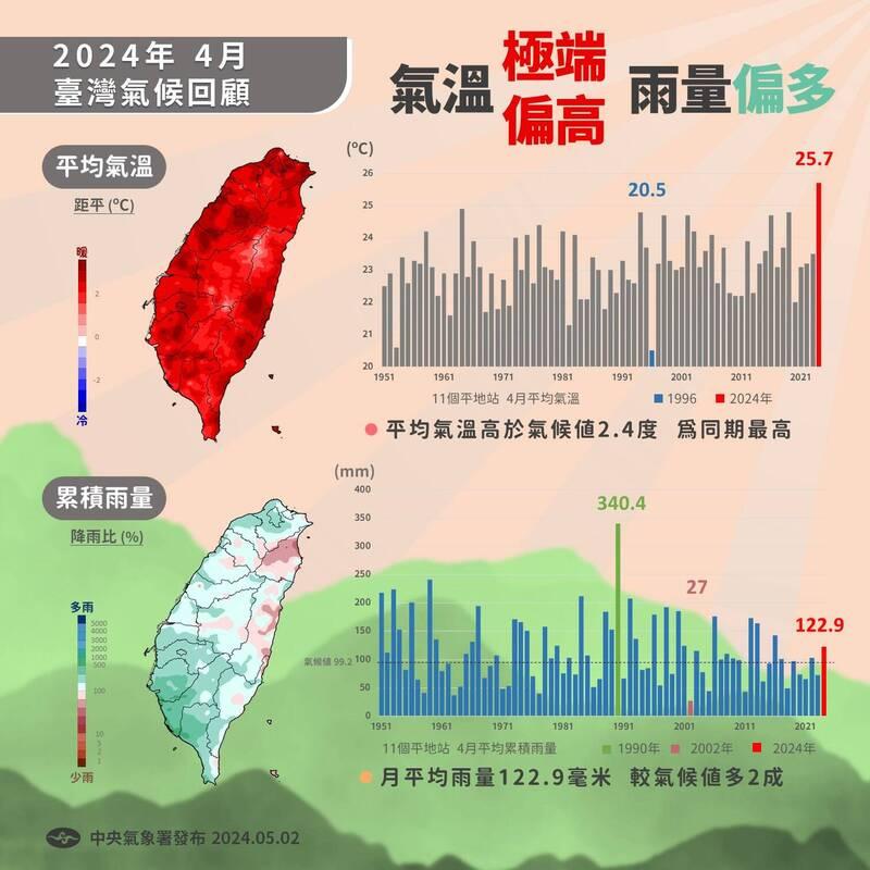 Average temperatures last month were 2.4°C higher than average for the same period, and the highest ever recorded for the month of April, Central Weather Administration (CWA) data showed.