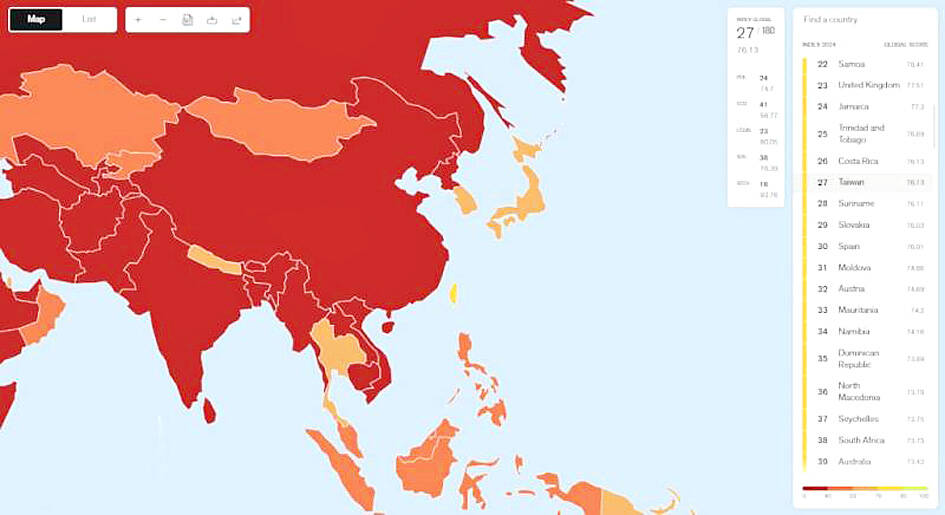 Taiwan’s ranking placed it fourth in the Asia-Pacific region, behind New Zealand, Samoa and East Timor, which were ranked 19th, 20th and 22nd, respectively, but ahead of Australia (39th), South Korea (62nd), Japan (70th) and Thailand (87th).