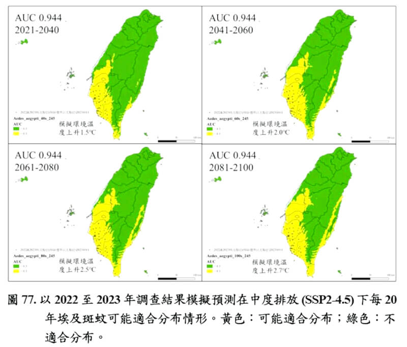 A 2.5oC increase by 2080 would see the mosquitoes extend their range further north to Taichung’s Tanzih District (潭子) in the west, it said.