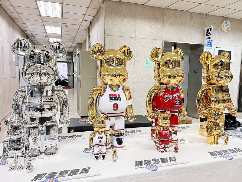 Twelve Be@rbrick models are displayed yesterday after being confiscated by Taipei police following a raid earlier this month of an alleged fraud ring. Vehicles including a Jeep Wrangler, Porsche and Mercedes-Benz, as well as about NT$1.72 million (US$53,068) in cash were also confiscated. The ring alleged raked in more than NT$300 million, Taipei prosecutors said yesterday.
