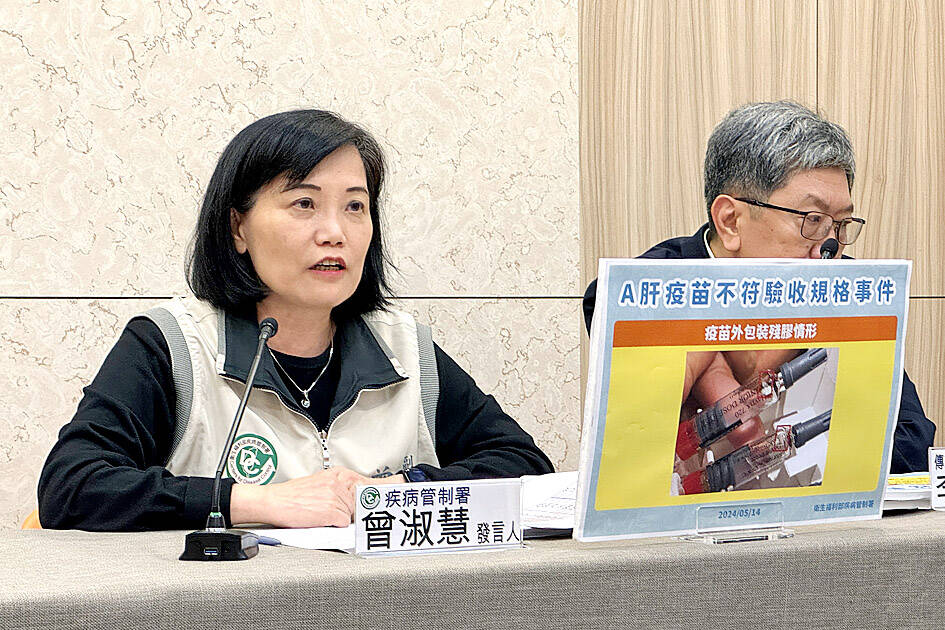 In late March, the centers received reports that hospitals and clinics had found adhesive residue on some syringes, rubber seals and outer packaging of hepatitis A vaccines, which are part of routine vaccinations for children, CDC Deputy Director-General Tseng Shu-hui (曾淑慧) said.