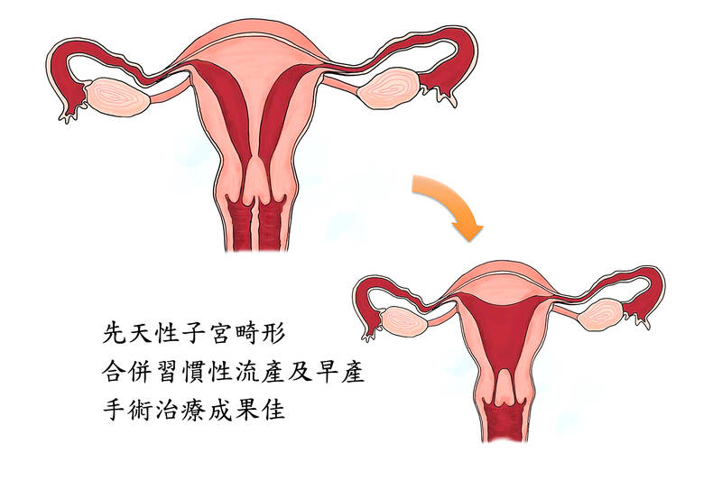 National Taiwan University Hospital Department of Obstetrics and Gynecology attending physician Yang Po-kai (楊博凱) said congenital uterine anomalies occur when an embryo is developing, and about 5 percent of all women have the condition.