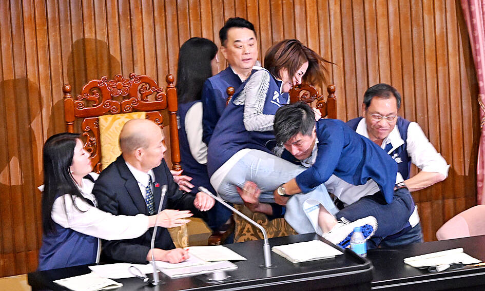 There was pushing and shoving when the session started in the morning as KMT lawmakers attempted to block access to the podium to shield Legislative Speaker Han Kuo-yu (韓國瑜) so he could preside over the session.