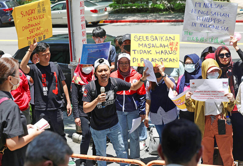 About 30 Indonesian migrant workers gathered outside the Indonesian Economic and Trade Office (IETO) to Taipei yesterday to demand better protection of their rights and the abolition of the broker system.