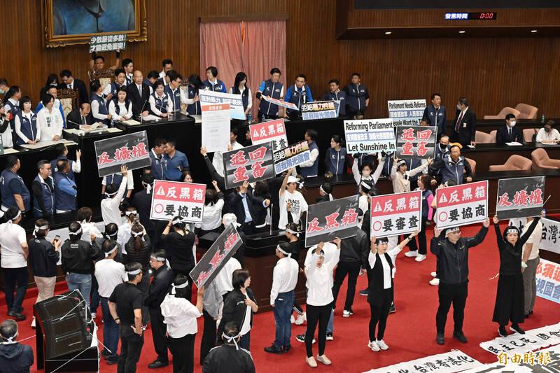 Chinese Nationalist Party (KMT) and Taiwan People’s Party lawmakers arrived at 5:30am to ensure they could occupy the podium when the doors opened at 7am.