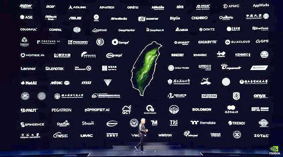 In a speech at the National Taiwan University (NTU) Sports Center on Sunday night, in which Huang described artificial intelligence (AI) as the driving force behind a new industrial revolution, the names of 17 local universities appeared on a slide in the background, along with others.