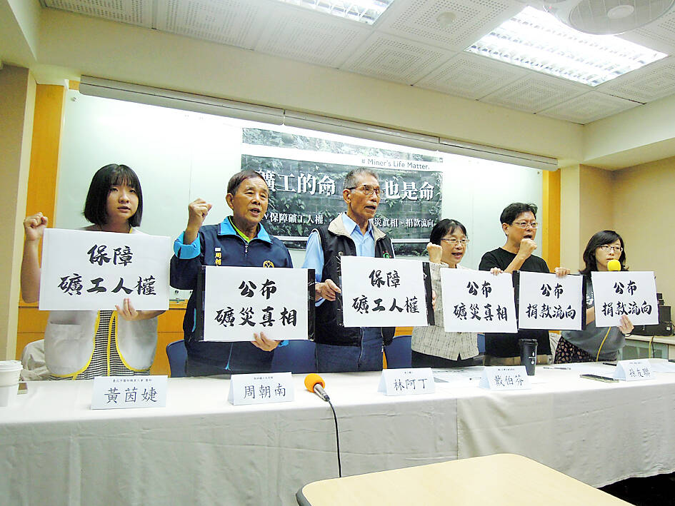 Coal miners’ retiree groups, representatives from the Houtong Miner’s Culture and History Museum in Rueifang, and the Taipei Doctors’ Union, who requested improved health insurance and better compensation for retirees, also participated in yesterday’s news conference.