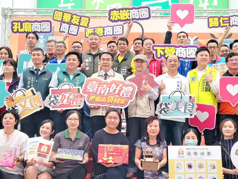 Tainan Mayor Huang Wei-che, second row, fourth left, and other guests hold placards to promote this year’s “Tainan Souvenir” competition. The city government is to select 60 entries that it deems best represent the city. The deadline for application is July 15.