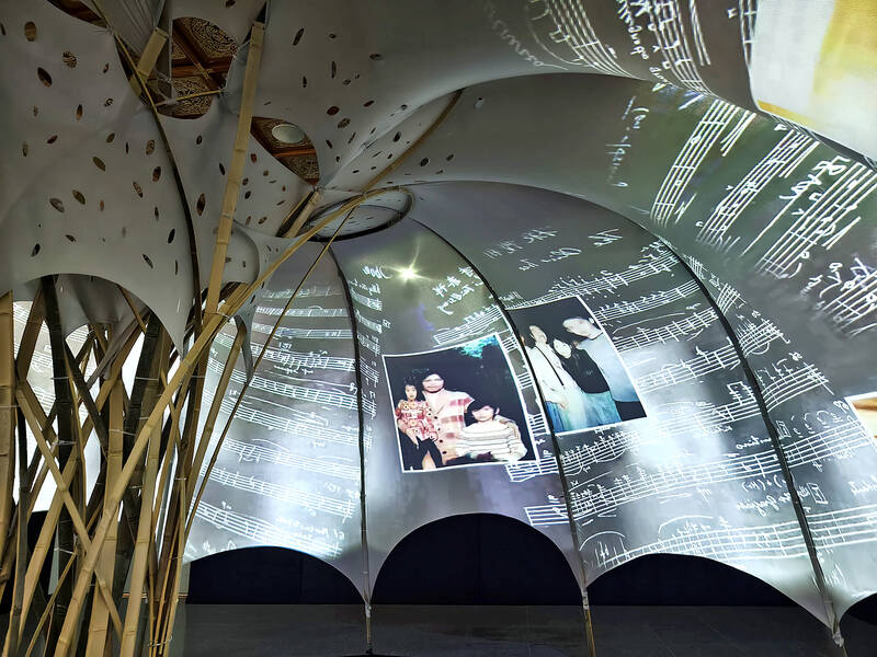 Photographs of Taiwanese composer Lee Tai-hsiang are projected onto a dome-shaped exhibit shaped like a tree to commemorate his hit song “Olive Tree” at the Chiang Kai-shek Memorial Hall in Taipei yesterday. An exhibition honoring a decade since the composer’s passing is on display at the hall until July 17, after which it is to move to the National Kaohsiung Center for the Arts.