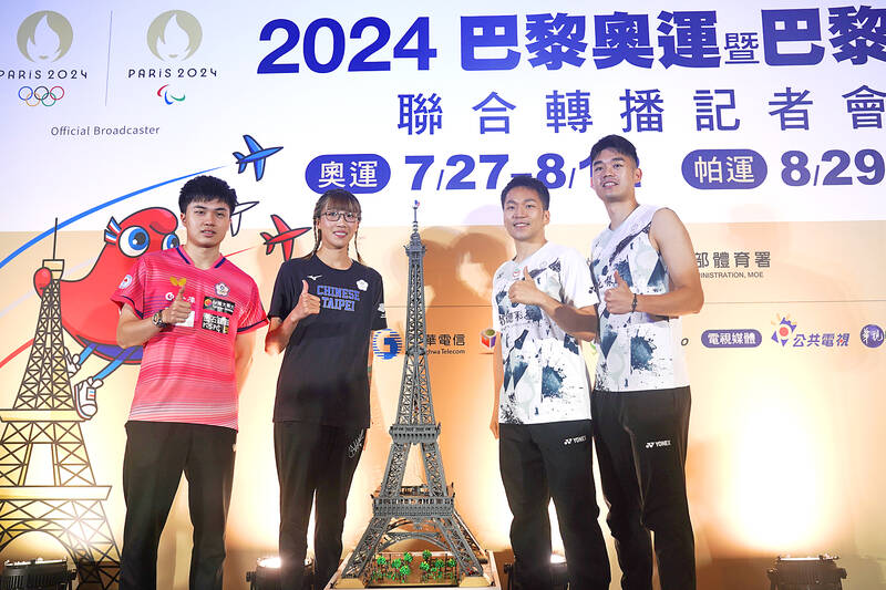 From left, table tennis player Lin Yun-ju, boxer Huang Hsiao-wen and badminton duo Lee Yang and Wang Chi-lin attend a news confernece hosted by ELTA TV in Taipei yesterday. It was announced at the news conference that ELTA TV, Chunghwa Telecom, Public Television Service and Chinese Television System would joinly broadcast this year’s Paris Olympic Games and Paralympic Games.