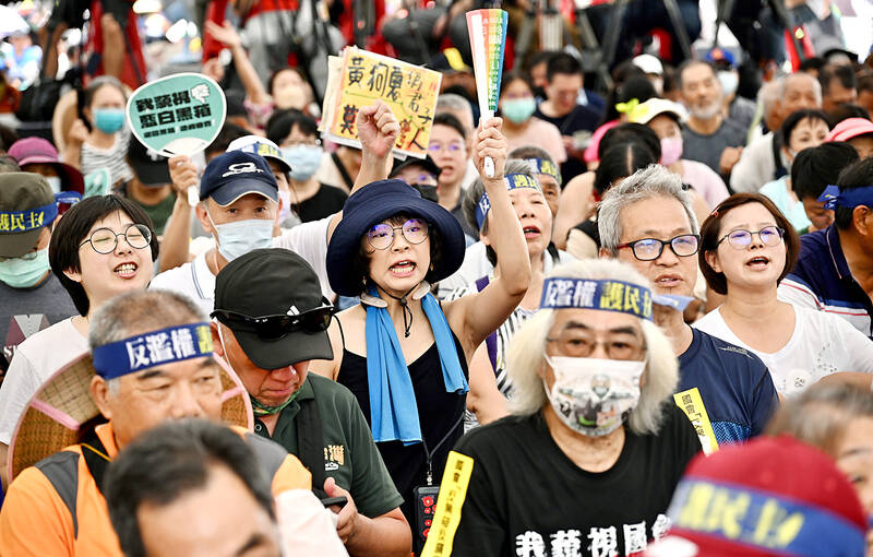 “This week’s ‘Bluebird’ gathering has shown the strength of Taiwan’s civil society ... each day has seen thousands of people participating at these outdoor lectures and speeches, who were not deterred by the scorching heat and thunder storms, and showed their courage and determination to protest outside the Legislative Yuan,” Taiwan Citizen Front executive Lo Yi (羅宜) said.