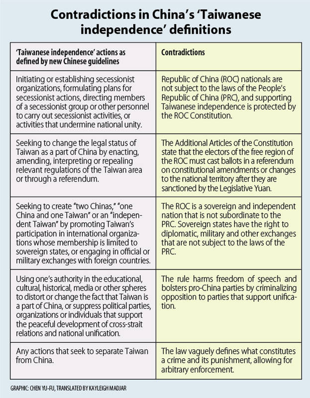 The guidelines are part of a long-prepared strategy for Beijing to weaponize its judiciary to criminalize Taiwanese independence and deter advocates with elaborately devised rules, Prospect Foundation vice president Raymond Sung (宋承恩) said, adding that the guidelines follow Beijing’s remark on May 21 that President William Lai’s (賴清德) inaugural speech was his “confession of Taiwanese independence.”