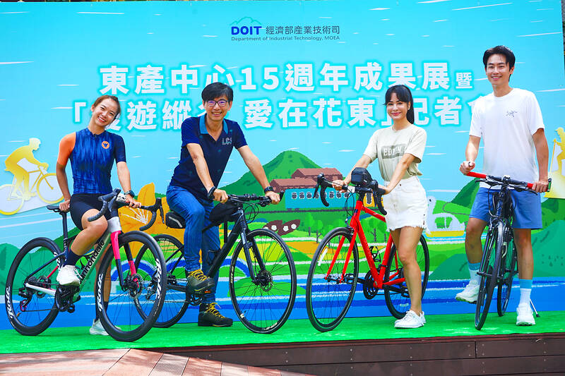 From left, YouTube creator One Wheel, Ministry of Economic Affairs Department of Industrial Technology Director-General Chiou Chyou-huey, actor Emmie Ries and television chef Max Yang yesterday straddle bicycles at a promotional event for hiking and cycling in the Hualien-Taitung valley at the Eastern Taiwan Industrial Technology Service Center in Hualien County. People who take part in an event the center is running would receive a prize after completing one of the trails it is promoting.