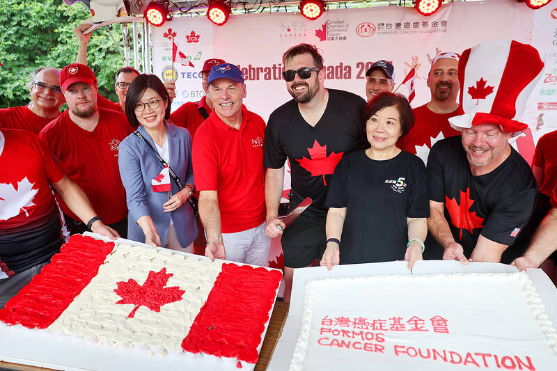 Canadian Trade Office in Taipei Executive Director Jim Nickel, front, third left, Ministry of Foreign Affairs North American Affairs Department Director-General Wang Liang-yu, second left, and other guests attend the Celebration Canada event at the Huashan Creative Park in Taipei yesterday. The event was held jointly by the Canadian Chamber of Commerce in Taiwan and the Formosa Cancer Foundation with the theme of “Stroll Life Festival” to promote anti-cancer lifestyles, as well as to let Canadians in Taiwan and the general public celebrate Canada Day, which is on July 1.