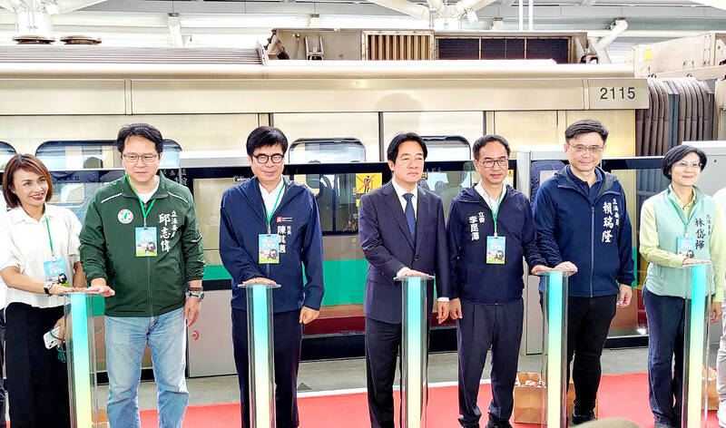 President William Lai, fourth right, Kaohsiung Mayor Chen Chi-mai, fifth right, and other guests attend a ceremony marking the beginning of trial runs on the extension of the Kaohsiung Mass Rapid Transit system at the Gangshan Station yesterday. The trial runs of the extension, connecting Lujhu and Gangshan districts, are to run until Aug. 31 and are free.