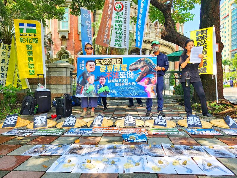 Representatives of civic groups from Yunlin County protest outside the Control Yuan in Taipei yesterday. The groups said that a planned extension of operations at the Mailiao coal-fired power plant was illegal and demanded that the Control Yuan investigate Premier Cho Jung-tai, Minister of Economic Affairs J.W. Kuo and Taiwan Power Co president Tseng Wen-sheng regarding the matter.