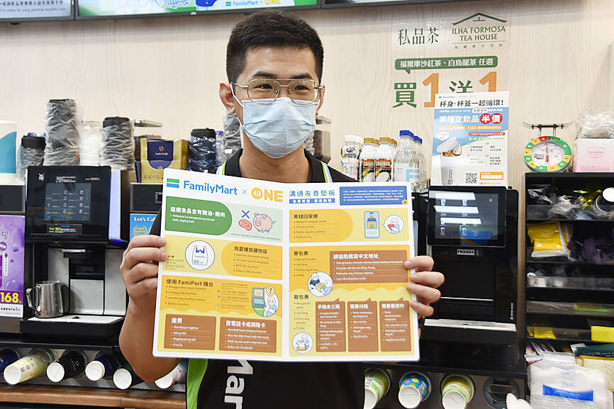 Convenience store chain Taiwan FamilyMart Co and non-governmental organization One-Forty on Tuesday introduced multilingual signs to direct people from four Southeast Asian countries to the services they most commonly use as part of a “migrant-friendly services” initiative.