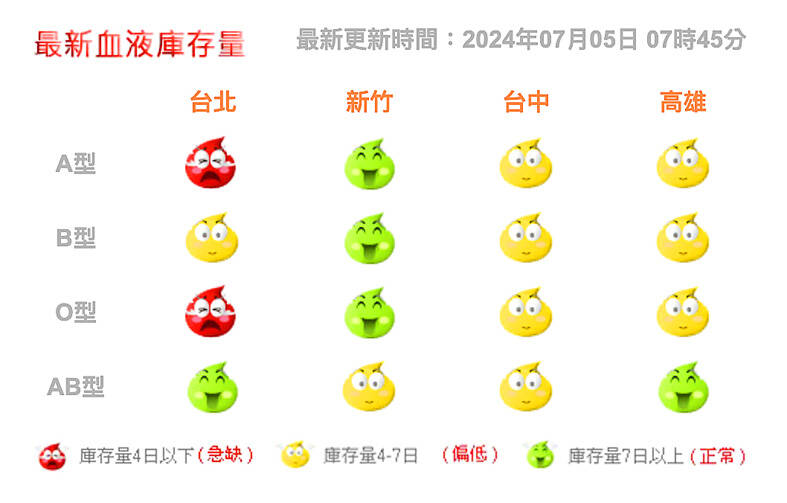 Taiwan Blood Services Foundation data showed that as of 7:45am on Friday, type AB was the only blood type at the normal level of supply in Taipei, while type B was low, and types O and A were critically low.