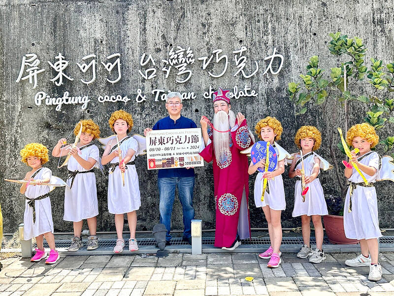 Children dressed as Cupid and a person dressed as matchmaking deity the Old Man Under the Moon pose for a photograph at a news conference in Pingtung County yesterday promoting the Pingtung Chocolate Festival on Aug. 10, which coincides with the Qixi Festival, or Lovers’ Day, in Taiwan.