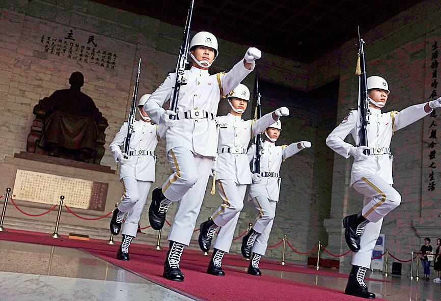 The changing of the guard each hour at the Chiang Kai-shek Memorial Hall in Taipei is a major tourist attraction, but starting from 9am on Monday, the ceremony is to be moved outdoors to Democracy Boulevard, outside the eponymous blue-and-white memorial hall.