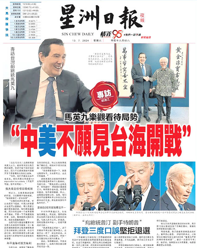 Asked about whether the KMT is on the same page as the Democratic Progressive Party (DPP) and the Taiwan People’s Party (TPP) on the issue of Taiwanese independence or unification with China, Ma told the Malaysian Chinese-language newspaper Sin Chew Daily that they are not.