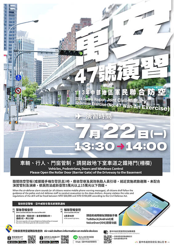 Traffic controls are to be imposed and people on the streets would be required to enter shelters during the 30-minute Wanan air defense drills across Taiwan from Monday to Thursday next week.