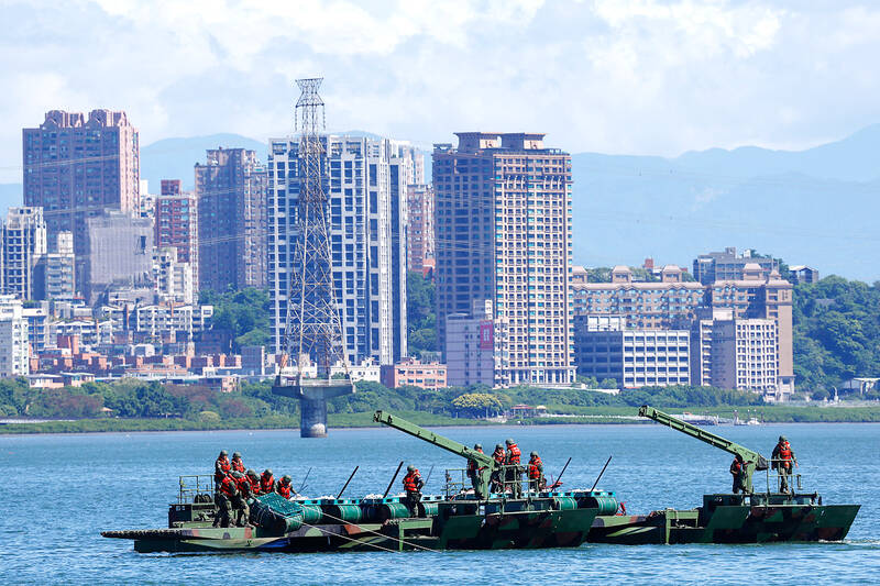 At the mouth of a major river leading to Taipei in Tamsui District (淡水), soldiers practiced laying mines and nets to stymie landing enemy forces, part of a series of drills designed to prevent the capital from being seized.